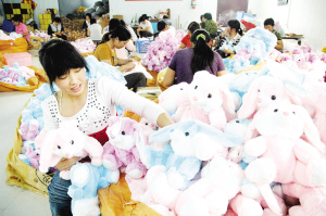 9月14日,在淮阳县贝贝玩具有限公司,女工们在加紧制作布艺玩具。淮阳县白楼镇于庄行政村女青年劳从梅,在外打工学到技术后返回村里并在县妇联的关心和支持下,投资200多万元创办起了玩具加工厂,专业从事毛绒玩具、布绒玩具设计、生产和销售,产品远销美国、日本、澳大利亚、俄罗斯等10多个国家和地区,年收入500多万元,实现利税30多万元,不仅吸纳了村里120多名留守妇女就业,还大大促进了村民增收。