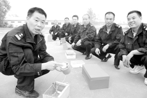 9月16日上午,市公安局排爆专家李春伟(左一)在教民警如何排除定时炸弹。李春伟利用业余时间苦心钻研防爆排爆技能和宣讲防恐知识,近年来,他已为当地排除险情1000多次,义务为社区群众宣讲防恐知识近百次。任君箫 摄