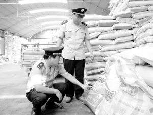 昨天上午,扶沟县工商局经检队执法人员在一农资门市部查看农资。目前,我市已进入秋收冬种的关键农时,大量农资商品上市。为确保农资消费安全,市工商局将组织执法人员在全市范围组织开展为期一个月的“红盾护农保秋冬种”专项执法行动,重点针对种子、农药、化肥、农机及其配件等农资产品进行检查。晚报记者 金月全 摄 线索提供 付昌 志勇
