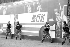 在比赛现场,武警特战队员们上演了一出扣人心弦的反恐作战演习,在现场还原了菲律宾人质劫持事件:成都某地,一辆旅游大巴被6名匪徒劫持,武警四川总队反恐特战队员接到命令后立即出动,队员们默契配合作战,在最佳角度用狙击枪精准狙杀“劫匪”,成功解救人质。