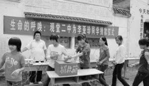 9月17日上午,鹿邑县观堂乡党委、政府和中心校在该乡二中举行了“生命的呼唤——爱心捐助仪式”,为该校突患血癌的14岁女生李亚珍献爱心捐款。乡领导、老师、学生纷纷伸出援助之手,仅半个小时就收到捐款5000多元。晚报记者 侯国防 通讯员 刘宏彬 摄