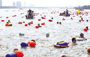 9月18日,爱好者们在闽江畅游。当日,2010年“无线电杯”闽江千人长泳活动在福州举行,1500多名爱好者畅游闽江,迎接中秋佳节。新华社发