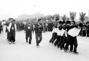 为活跃全县人民的业余文化生活,昨日,太康县举办了该县首届农民运动会。此次农民运动会设有掰手腕、推轮胎、拔河、踢毽子等数十个比赛项目,有来自全县23乡镇的1000多名农民运动员参加。图为运动员在比赛齐心协力运动项目。记者 孙安平 摄