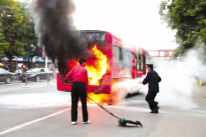 下班路过此处的市商业银行职工高建中看见该公交车尾部冒出黑烟及火花,他赶紧跑回单位,喊来两名同事拿着灭火器前来救火。经过陈师傅及高建中等人十多分钟的扑救(如图),用光了7个灭火器才把火扑灭。“多亏他们出手相助,给了乘客充足的逃生时间,否则后果真不堪设想。”陈师傅说。
