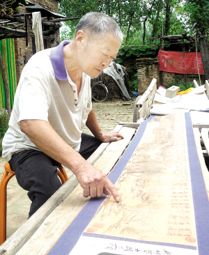 9月27日,商水县练集镇闫桥村七旬的老支书闫兴挺正在欣赏自己精心描摹的《清明上河图》。