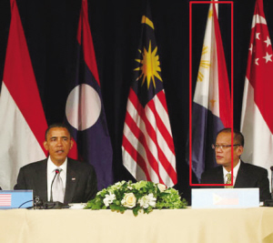 东盟领导人与奥巴马会晤的照片后,有人发现菲总统阿基诺身后升挂着的国旗红条在上、蓝条在下。菲律宾国旗左侧为白色等边三角形,内有一个金色太阳和3颗黄色五角星;右侧由一个蓝色直角梯形和一个红色直角梯形组成。