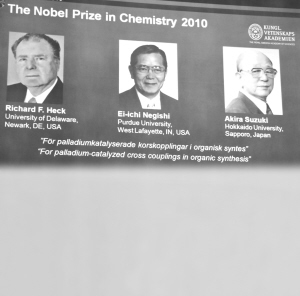 2010年诺贝尔化学奖于当地时间10月6日11时(北京时间17时)在瑞典皇家科学院揭晓,美国科学家理查德·赫克、日本科学家根岸英一和铃木章因创造出更有效而且简单的、用来“构建复杂碳基分子”的“碳原子连接方法”而获奖。他们三人将分享1000万瑞典克朗(约合146万美元)的诺贝尔化学奖奖金。据介绍,这三位科学家创造的“钯催化的交叉偶联方法”能够使稳定的碳原子更容易联结在一起,合成复杂的碳基分子,同时有效避免了过多不必要的副产品的产生。