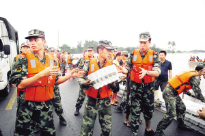 10月8日,武警官兵在海南省万宁市万城镇乌场村向船上搬运救灾物资。据初步统计,海南暴雨导致16个市县受灾,全省1160多个村庄受淹,160余万人受灾,紧急转移21万余人。 新华社记者 侯建森 摄