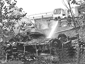 10月9日,消防人员在事故现场灭火。当日8时40分许,在宁合高速引导线由西向南京方向,一辆水泥槽罐车与一辆湖北籍大客车因大雾相撞,起火后冲出护栏,翻到匝道下(距离路面5米),槽罐车叠压在大客车上。事故已造成17人死亡,23人受伤住院,其中6人重伤。目前,事故原因正在调查中。新华社发