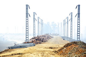 昨天,在周口迎宾大道旁,工人正为横穿迎宾大道的铁路立交桥浇筑桥墩。目前,漯阜铁路复线电气化改造工程进展顺利,至2011年4月将全部完成并投入运营,建成后将成为年运量达到亿吨的大能力运输通道,把豫皖两省的各大矿区、粮食生产区、风景旅游区连接在一起,形成一条重要的经济带,对实现国务院加快中部崛起战略目标起到有力的推进作用,漯阜铁路将真正成为造福豫皖两省的“黄金纽带”。