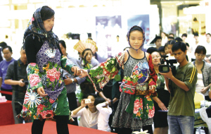 10月10日,在宁波举行的“旧衣新秀DIY”现场制作大赛上,一对母女身穿旧衣物翻新的服装走秀。