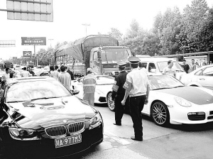 9月29日,在成都三圣乡红砂村红绿灯口,一辆牌照为“渝BA0266”的大货车因超载而刹车失灵,连撞劳斯莱斯、兰博基尼、保时捷等三辆豪车,无数人走近豪车,拿出了随身携带的各种手机一阵猛拍。近日这组车祸变“车展”的照片传上微博引来网友围观,网友介绍,三辆车中保时捷100万元,兰博基尼400万元,劳斯莱斯500万元,3辆车的维修费用将达到220万元。(南方 荐)