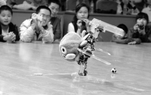 10月10日,在合肥中国科学技术大学举行的大学生机器人大赛中,机器人版章鱼帝大秀预言绝活。当日,中国科学技术大学第十届机器人大赛在合肥举行。当这只蓝色的章鱼机器人开始挥动手臂时,全场响起了掌声和笑声。“保罗”首先成功地预言了西班牙队获胜,然后一腿将一个小足球踢进网中,接着又开心地在音乐中翩翩起舞。它6条透明的腿支撑着圆圆的身体做出各种动作,包括滑行、行走和翻滚等。在舞蹈的最后,它甚至灵活地翻了个身,赢得了大家的掌声。新华社发