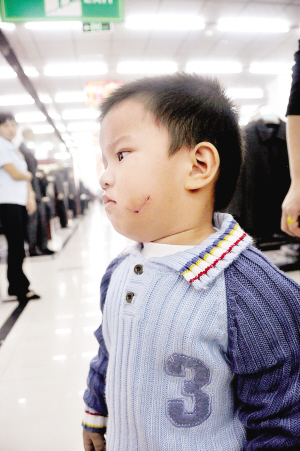 据承女士介绍,10月2日中午,她带着3岁的儿子来到新大新服饰鞋业广场购物。13时50分许,承女士拿着新买的裤子到商场二楼裁裤腿期间,见3岁的儿子很想到商场的游乐园里玩,她就把儿子送了进去,并一直在外等着。没想到,意外发生了。“儿子在游乐园里的蹦蹦床上玩耍时不慎摔倒,脸部被外露的角铁刮破,当即痛得哇哇大哭。见儿子满脸是血,当时差点没把我吓死。我冲进游乐园,一手按住伤口止血,一手抱起儿子往楼下跑,当时商场里有很多工作人员,可就是没一个人过来帮忙。”承女士抱着嗓子都哭哑了的儿子打了一辆出租车来到医院。“经救治,儿子的左脸缝了15针,伤口足有4厘米长(如图),接诊的医生说,儿子的脸上肯定会留下难看的疤痕。”一提起儿子,承女士心疼得只想落泪。