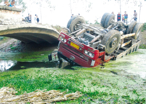 当日下午,记者在现场看到,这座小桥桥宽近4米,两侧桥栏坍塌严重,只剩下一角还有残留的桥栏,桥下漂着大片浮萍的河面上,一辆自卸型运输卡车身陷泥潭,四轮朝天。据悉,当日16时30分左右,该车刚行驶到桥头,左前轮下的桥面突然坍塌,车辆随之坠翻河中,车上装载的沙子倾翻河底,司机侥幸逃出,由于大腿部受伤,被群众及时送往附近医院救治。
