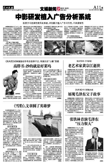 抗战剧《雪豹》继今年6月在广州台、北京台等地方台收视夺冠后,又转战卫视再创奇迹。剧中,一向走顽皮小生路线的文章首次以冷静沉稳、刚毅果敢的“纯爷们”形象示人,他那忧郁的气质和神乎其神的枪法不仅迷倒无数女观众,更让该剧的网络点击率一路上扬,奇艺网显示,该剧本月18日新增的点击率就高达260多万次。