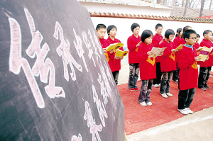 为弘扬国学经典,传承中华美德,培养民族精神,李灵希望小学率先在全县农村小学开展“国学经典诵读进课堂”活动,并精挑了20多名留守儿童组成《弟子规》朗诵队,激发学生学习经典文化的热情,培养读书兴趣,提高人文素养。 晚报记者 杜欣 摄