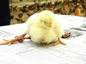 当日上午,记者在智丽的养鸡场里,见这只“四腿”雏鸡全身长着嫩黄色绒毛,除了有两条能够勉强支撑身体晃悠着走动的腿之外,它的尾部还长有两条腿,而且多出的两条腿基本拖在地上,经常被别的小鸡啄着玩。