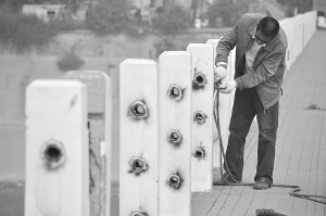 昨天上午,在市区沙颍河八一路大桥上,工作人员正在拆除桥栏。目前,桥上的路灯、通信线路、管道等正在紧张拆除中。晚报记者 朱海龙摄