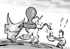 东方网10月20日报道,2003年,陕西三门峡库区的11个移民村作为泄洪区迁徙。2004年,国家下拨5906万元灾后重建款,两年间真正发到灾民手里的重建款只有50万元,不足1%。在此期间,华阴市耗资1600万元建起了市委、市人大新办公大楼。陶小莫 /漫画