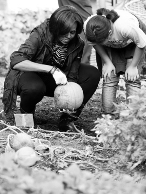 20日,美国华盛顿,美国第一夫人米歇尔·奥巴马与小学生一起收获白宫菜园里种植的蔬菜。新华社发