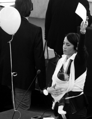 20日,欧洲议会在法国的斯特拉斯堡为延长产假的提案举行投票,代表丽希亚·隆苏依带着孩子出席会议。新华社发