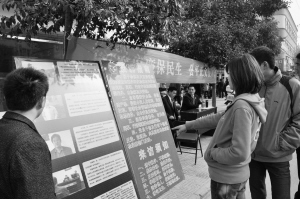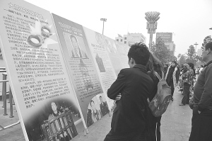 昨天,在市区七一路旁,路人正在观看一些身边的贪污受贿等违纪违法典型案例。据了解,市检察院把市民熟悉的6个因贪污受贿走进监狱的人的案例制作成展版,树立在市区街头,对参观者进行教育,许多市民深受触动。 晚报记者 朱海龙 摄