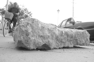 10月24日,在淮阳县东蔡河桥上,一块巨石横放桥面中央。据了解,这块巨石放在这儿已经有好几天了,是有关部门修补桥面时怕大车从桥上通过轧坏路面而放置的。对此,不少市民认为,施工方怕车轧坏路面可以在桥头放置警示牌,放巨石挡道对行人和非机动车都有安全隐患。 晚报记者 杜欣 摄