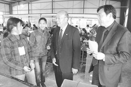台湾制鞋工业同业公会理事长林昭杰(右二)等人在西华凯鸿鞋业有限公司了解企业生产情况。记者 李寒 摄