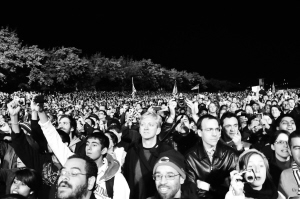 10月30日,人们在美国伊利诺伊州芝加哥市海德公园举行的集会上聆听总统奥巴马的演说。