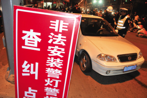 从10月28日开始,针对非法安装警用标志灯具车辆,市公安局的警务督察支队与交警支队联手开展设卡检查活动。据介绍,对检查出安装有非法警用装置的车辆,警方当场将其使用的非法警用灯具拆除、收缴,并对车辆驾驶员进行应有的处罚。晚报记者 朱海龙 摄