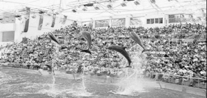 第二区:海洋剧场, 是海豚表演区,也是海洋馆的核心部分,内有海豚表演池、海豚放置池和1550座的观众席。观众席下部是培训室,再下层是较大的维生系统。海洋剧场屋面采用钢桁架上铺拉白色帆布,尖顶挺拔向上的造型,轻巧明快,是海洋馆的视角焦点。