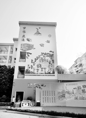11月2日,广州市天河区“践行文明公约,争做文明东道主”主题活动启动仪式暨昌乐小学“梦想·亚运”大型浮雕受赠、揭幕仪式在天河区昌乐小学举行。图为昌乐小学一幢教学楼墙壁上的大型浮雕作品“梦想·亚运”。