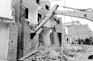 11月1日下午,川汇区政府会同市公安局、市规划局、市城管局等部门,对人民路拓宽改造过程中已拆迁补偿到位,但拆迁户又私搭乱建的违法建筑进行了依法强制拆除,拆除违法建筑面积达500多平方米。晚报记者 朱海龙 摄