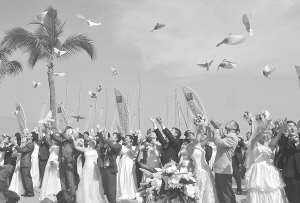 11月11日,新人们在深圳龙岗区南澳街道海边举行的“碳零排放”集体婚礼现场放飞鸽子。当日,一场“碳零排放”集体婚礼在深圳龙岗区南澳街道海边举行,37对新人参加婚礼。“碳零排放”集体婚礼搭台用的材料是低碳节能的环保材料,新娘的婚纱是用环保衣料制作的,参加婚礼的新人们在低碳宣誓板上写下低碳誓言。新华社发