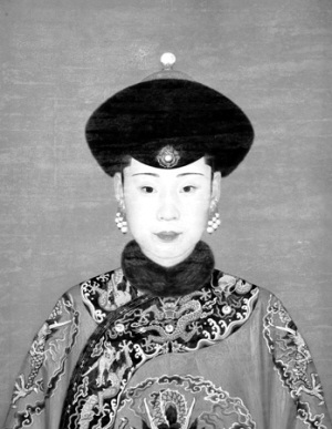 细观此幅油画仕女肖像,画中的青年女子仪态端庄,头戴貂毛冠,身着黄底绣团龙袍服,佩戴着晶莹硕大的珍珠装饰,衣着装束尽显其高贵的满清后宫妃嫔身份。由于画上无任何身份明示和画家署名,人们只能通过存世的其他清宫后妃画像来做出判断。