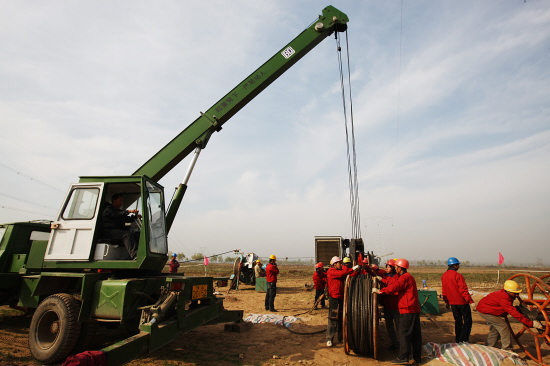 11月16日,在周口500千伏邵周Ⅱ回(漯河邵陵—周口淮阳)降压线路工程现场,电力施工人员正在112#杆塔旁忙着架线。 据了解,该工程是500千伏周口变电站的配套线路工程,总投资6700万元。它不仅是周口供电公司“136”电网建设工程项目之一,也是2010年度河南省重点建设项目之一。该工程目前已进入收关冲刺阶段,预计11月中旬完工。通讯员 魏树林 摄 500千伏邵周降压线路收