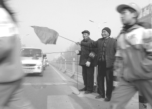 11月17日,78岁的王金石(左)和75岁的盖红彩相互配合,护卫小学生过马路。在山东临沂市兰山区,每当银雀山街道新区小学学生放学时,都会有7位耄耋老人守候在蒙山大道人行横道两边,拉起两条10余米长的绳子,截住车流,护卫孩子们过马路。据悉,7位老人都是附近社区居民,平均年龄75岁。蒙山大道是临沂市区主干道,车流量大,孩子们过马路经常出现险情。从2003年起,7位老人便开始用“一块方旗、一根彩绳”配合交警挡住车流的办法,为过往学生构筑安全通道。新华社发