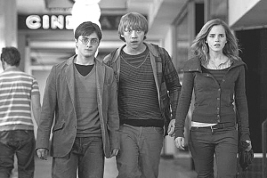 3位主人公哈利、赫敏和罗恩找到了伏地魔的其中一个魂器——金色挂坠。因为暂时还没找到能摧毁魂器的格兰芬多宝剑,他们只能轮流将魂器带在身上。魂器能影响人的情绪,而在一次幻影移行中受伤的罗恩尤其变得脾气暴躁。眼看哈利和赫敏越走越近,感觉自己受冷落的罗恩爆发了,他决定出走。但在哈利下水捞取格兰芬多宝剑差点溺死的时候,罗恩又回来救了他。筋疲力竭的哈利催促罗恩用宝剑摧毁魂器,但魂器却散发出强大的能量,在罗恩面前展现了一幅幻象:裸露的哈利和赫敏紧紧拥抱缠绵……