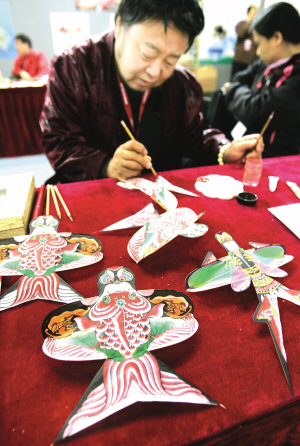 11月18日,民间艺人在北京文博会上现场制作微型风筝。