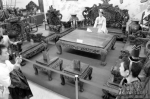 11月20日,广西南宁会展中心内,一套标价1.28亿元人民币的“天下第一座”,携君臣及侍卫闪亮登场,吸引众人眼球。据悉,该套沙发共12件,为广西凭祥市一唐姓商家从近百吨的越南黄花梨中,海选出上品的油梨根材,并聘请60多名工匠历经5年雕制而成。而在旁边展位,一套“龙凤呈祥黄花梨大宝鼎沙发”也标价一亿两千万元叫卖,让人瞠目。中新 摄