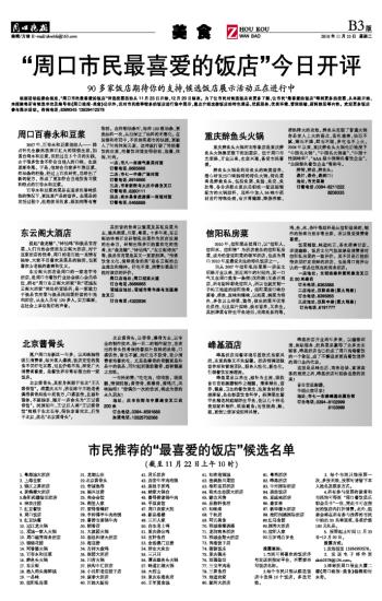 根据活动组委会规定,“周口市民最喜爱的饭店”评选投票活动从11月23日开始,12月20日结束。为了让市民对候选饭店有更多了解,让市民“最喜爱的饭店”得到更多的投票,从本期开始,本报除将所有候选单位及编号在《周口晚报·美食》公示外,还对市民推荐较多的饭店进行集中展示,重点介绍这些饭店的特色菜品、优质服务、优美环境、管理经验、厨师绝活等内容。欢迎更多饭店