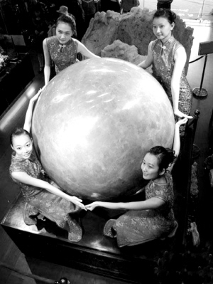 11月21日,目前世界上发现的最大夜明珠在海南文昌市宝玉宫展出,专家估算其价值20亿元人民币。据了解,直径约1.6米,重达6吨的夜明珠是首次现身,也是首次在海南亮相,如此巨大的夜明珠在关闭光源的黑暗环境中能发出晶莹透亮的光芒,令前来参观的嘉宾与市民叹为观止。