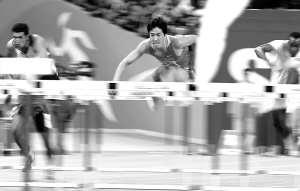 11月22日,中国选手刘翔(中)在男子110米栏预赛中。当日,在广州进行的第16届亚运会男子110米栏预赛中,刘翔以13秒48位列小组第一,轻松晋级决赛。新华社记者任正来摄