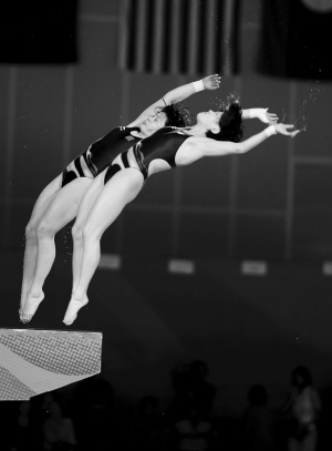 跳水——女子双人十米跳台:中国选手陈若琳/汪皓夺冠 11月23日,中国选手陈若琳/汪皓在比赛中起跳。当日,在广州进行的第16届亚运会跳水项目女子双人十米跳台决赛中,中国选手陈若琳/汪皓以360.06分的成绩夺得金牌。