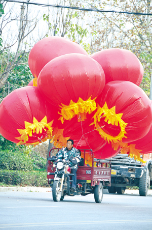 昨天,在周口市区七一东路,记者看到一辆机动三轮车拉着7只红色大气球满街跑,行驶过程险象环生,行人不禁捏了一把汗。晚报记者 朱海龙 摄