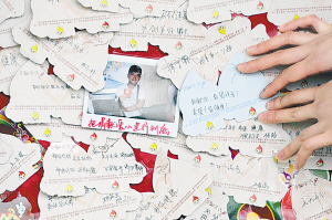 11月30日,来自广东的黄俞仁在北京西单献血屋献完血后,在爱心卡片上写上“我献血,我很快乐”。