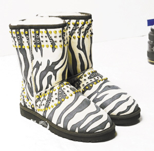 在这次合作系列中,Jimmy Choo并没有喷洒过量的女人味,反之保留了UGG的短靴原型,缀以Jimmy Choo经典的星星铆钉,或缀流苏及金属扣眼,要不然就是印上豹纹及斑马纹等图案,设计由以往的含蓄转化成眼前的直接,你总能从线索中,沿途找得到Jimmy Choo的爱。当然,大牌力撑、跨界合作的结果往往就是价码看涨的代名词,这一双特别版雪靴,价格直奔五千港元!