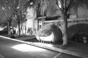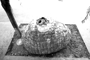 戴海飞的公司位于海淀区成府路的一个大院里,在公司楼下,一座小屋像一颗巨大的鸡蛋,立在草坪上。小屋两米来高,麻袋拼成的外皮。“蛋壳”上,被掏出一个椭圆形的小门,没有锁。小屋的下边,装有轮子,可以挪动。小屋由竹条编制而成,在竹条外,还有竹席、保温膜和防雨膜,最外边,是麻袋拼成的保温层,麻袋里填充着发酵木屑和草籽,“到了春天,里面可以长出草来。”戴海飞介绍。