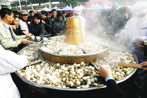 12月1日,上海街头一口硕大的火锅吸引了千余名游客前来品尝。